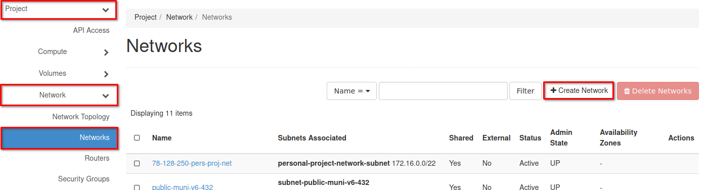 Navigate yourself towards Project > Network > Networks in the left menu and click on the Create Network on the right side of the window. This will start an interactive dialog for network creation.