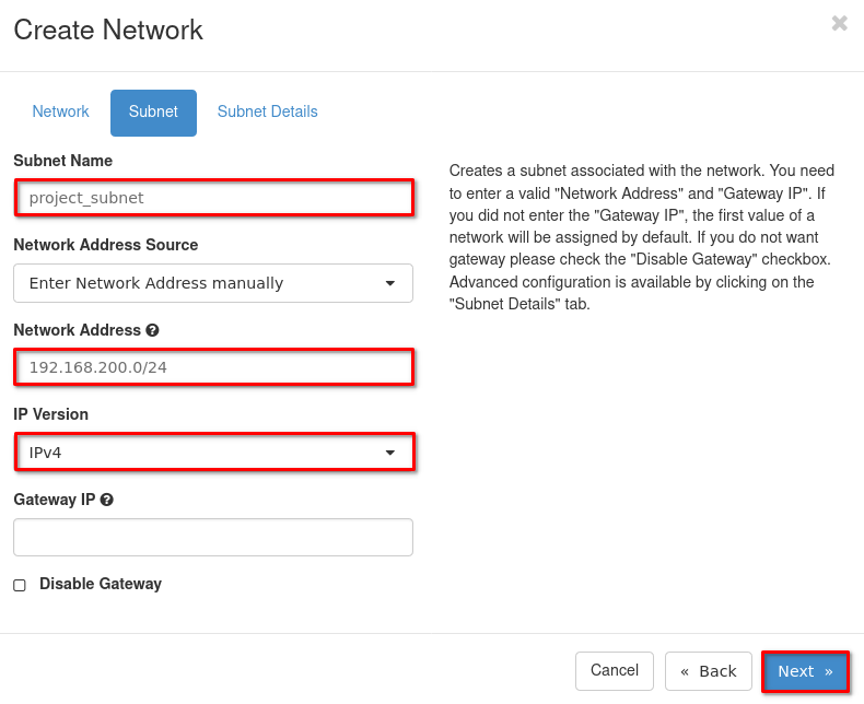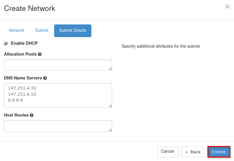 3. For the last tab Subnet Details just check that a DNS is present and the DHCP box is checked, alternatively you can create the allocation pool or specify static routes.