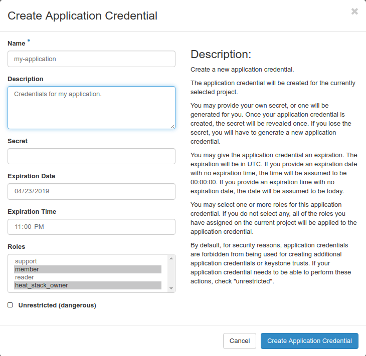 If you decide to select specific roles, you should always include at least the member role. If you are planning to use the orchestration API, add the heat_stack_owner role as well and check Unrestricted.