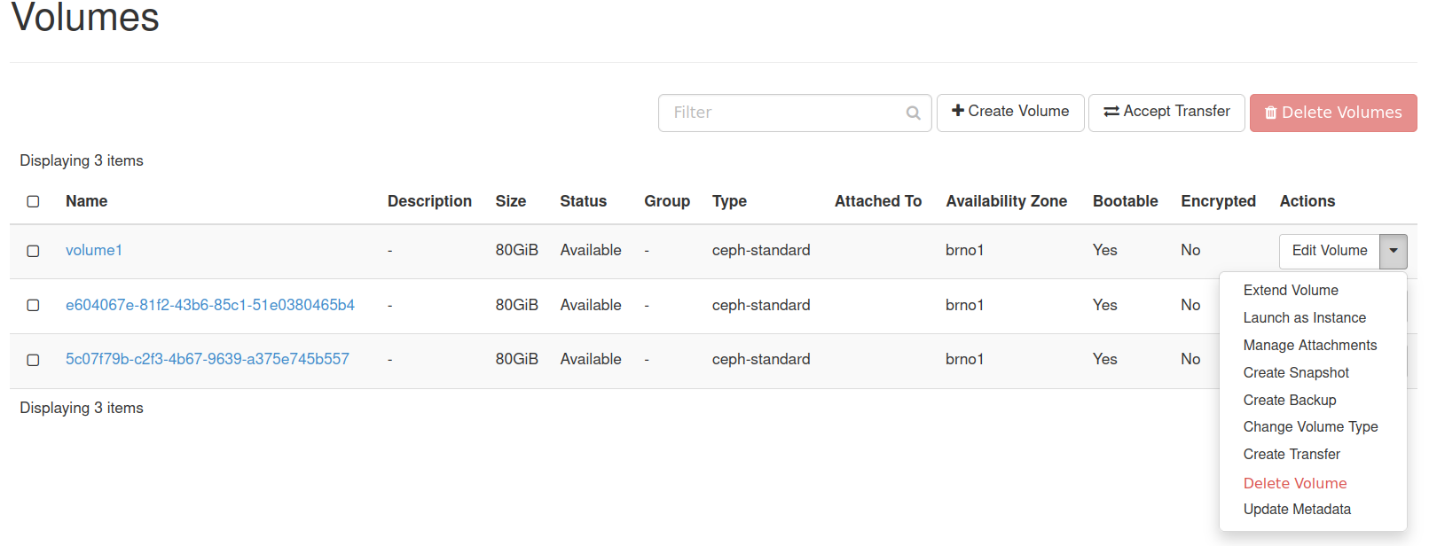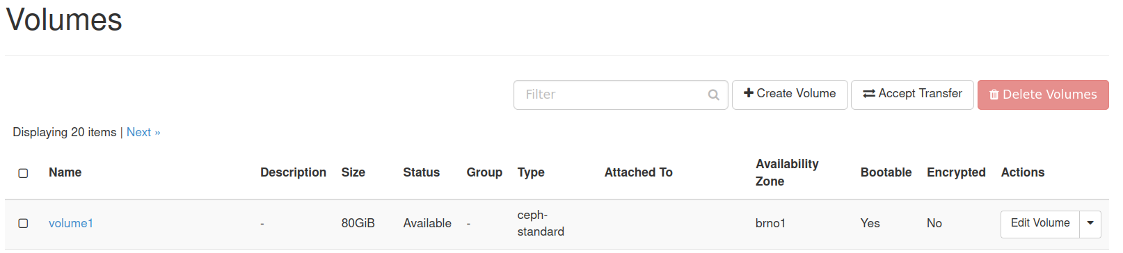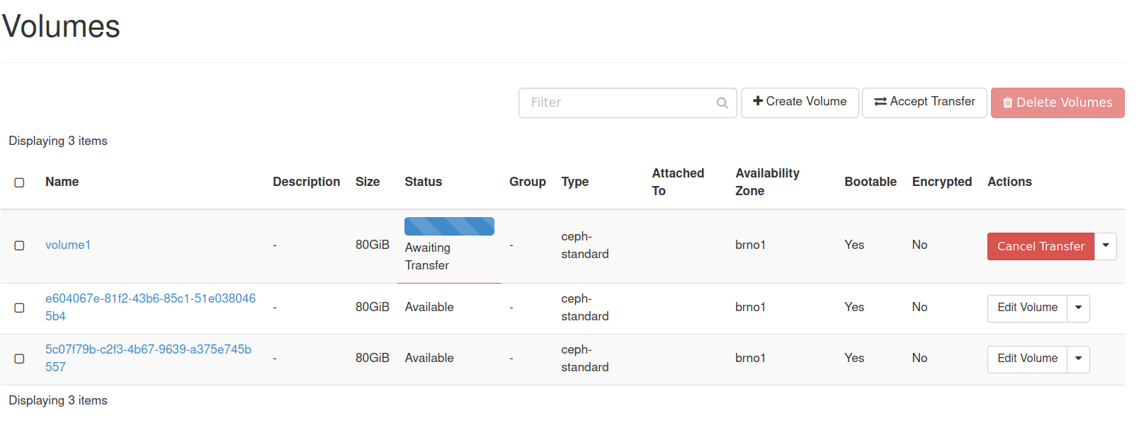 6. In horizon, switch to the destination project and go to the Volumes menu. Press the Accept Transfer button.