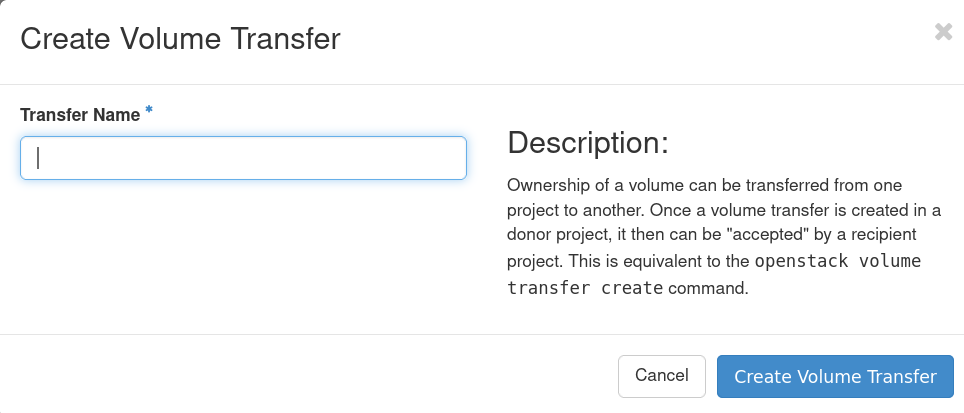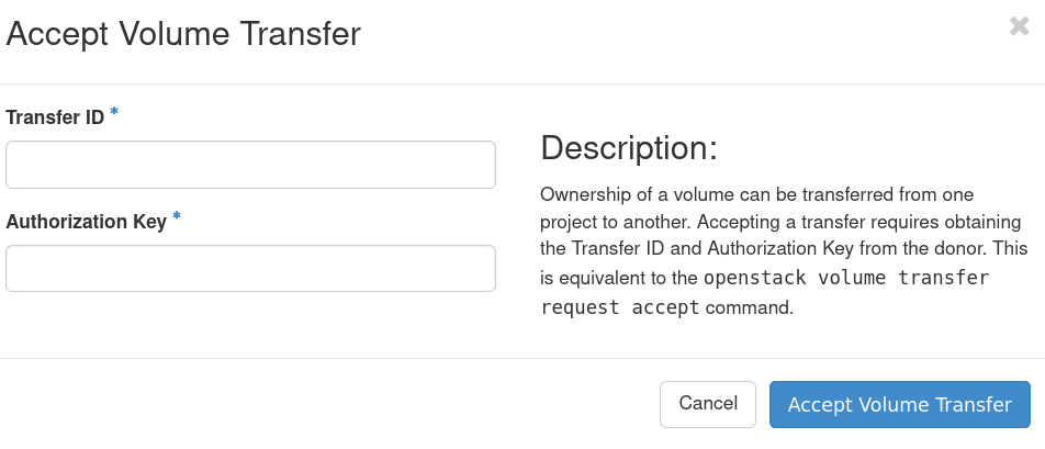 7. Accept the volume transfer in the destination project. You will need Transfer ID and Authorization Key from the previous step.