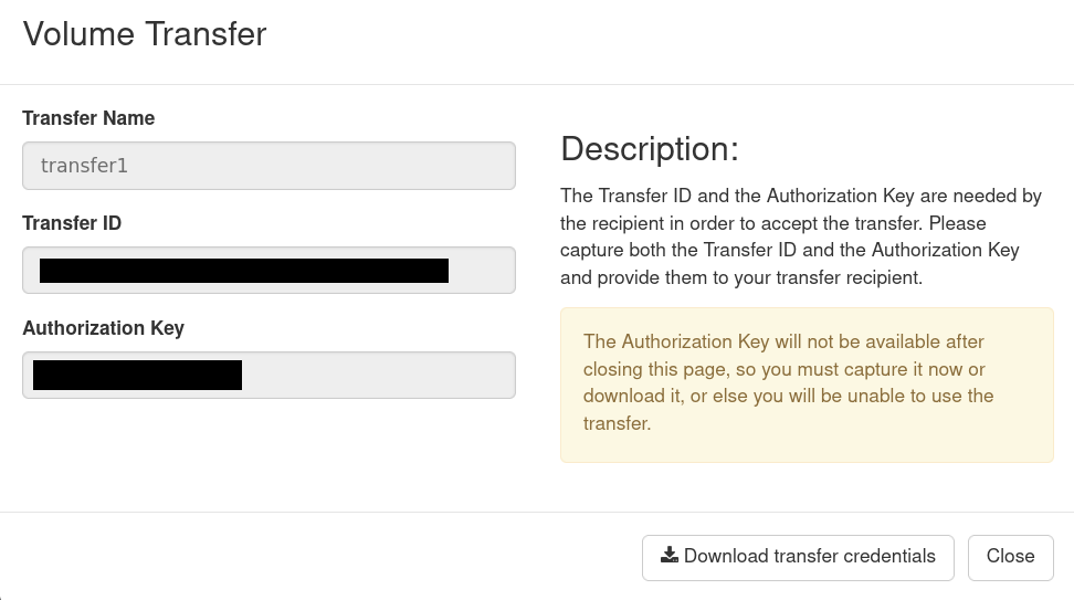 4. New volume transfer is created. You will need Transfer ID and Authorization Key. You can download them to your computer using Download transfer credentials.