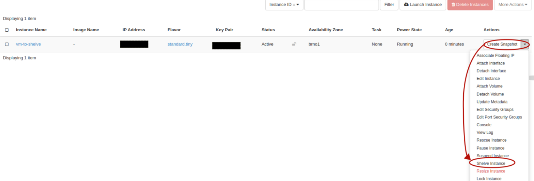 Go into your instance list, located at the left menu bar on the path Project>Compute>Instances. Then you select the Actions menu located on the right side of the listed instances. After that, choose the running instance to shelve and select from the Actions menu the option Shelve Instance and click it.