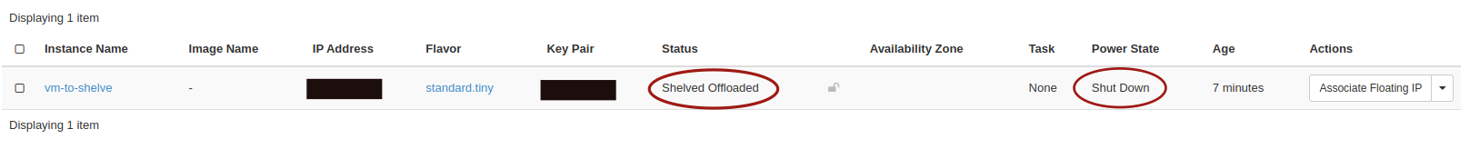 Once the shelving process finishes, you can check that the instance is in the status Shelved Offloaded and its power state is Shut Down.
