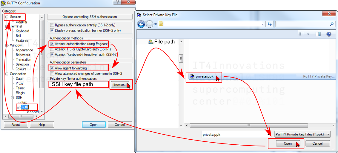 - Category - Connection - SSH - Auth: Select Attempt authentication using Pageant. Select Allow agent forwarding. Browse and select your private key file.