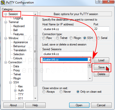 - Save your configuration in the Session - Basic options for your PuTTY section with the Save button.