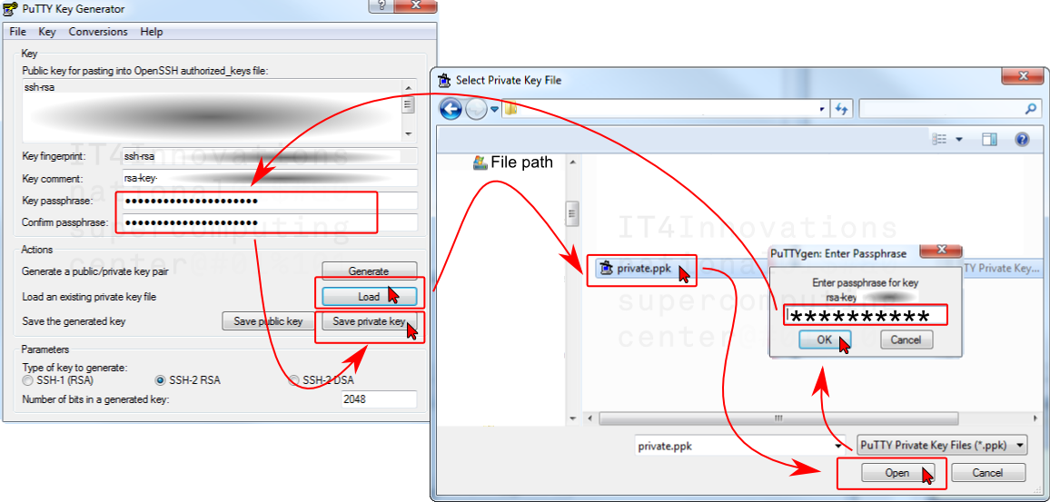 - Enter a comment for your key using the 'username@organization.example.com' format. Enter a key passphrase, confirm it and save your new private key in the ppk format.