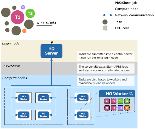 Once the HyperQueue server is running, you can submit jobs into it. Here are a few examples of job submissions. You can find more information in the documentation.