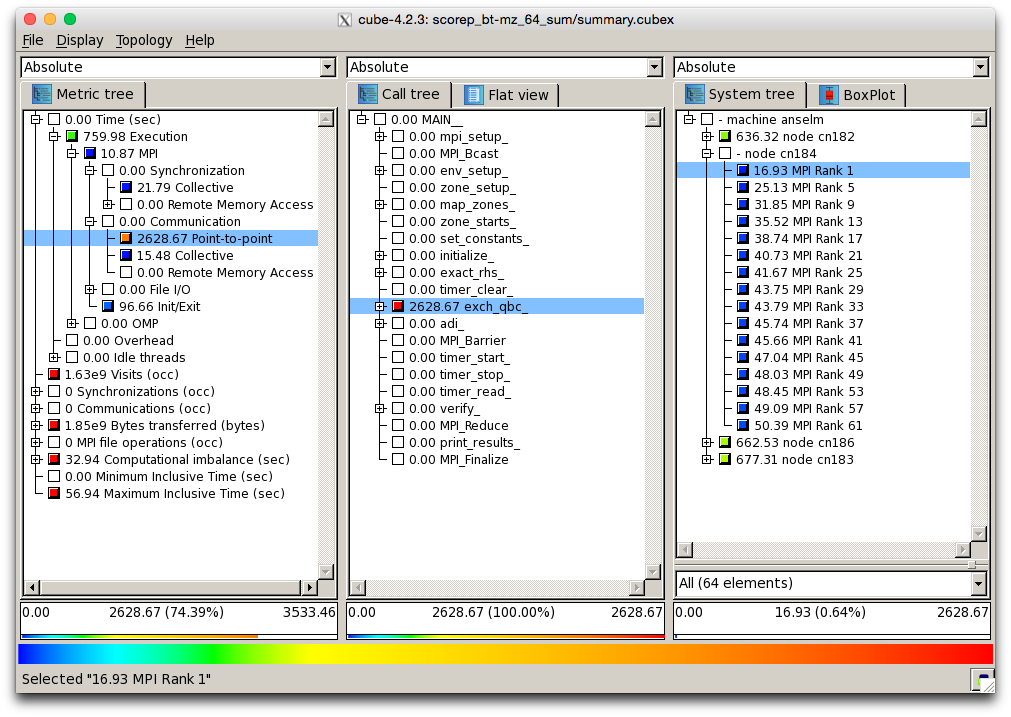 Each node in the tree is colored by severity (the color scheme is displayed at the bottom of the window, ranging from the least severe blue to the most severe being red). For example in Figure 1, we can see that most of the point-to-point MPI communication happens in the exch_qbc routine, colored red.