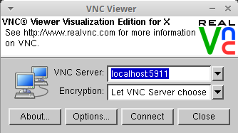 The VNC server runs on port 59xx, where xx is the display number. To get your port number, simply add 5900 + display number, in our example 5900 + 11 = 5911. Calculate your own port number and use it instead of 5911 from examples below.