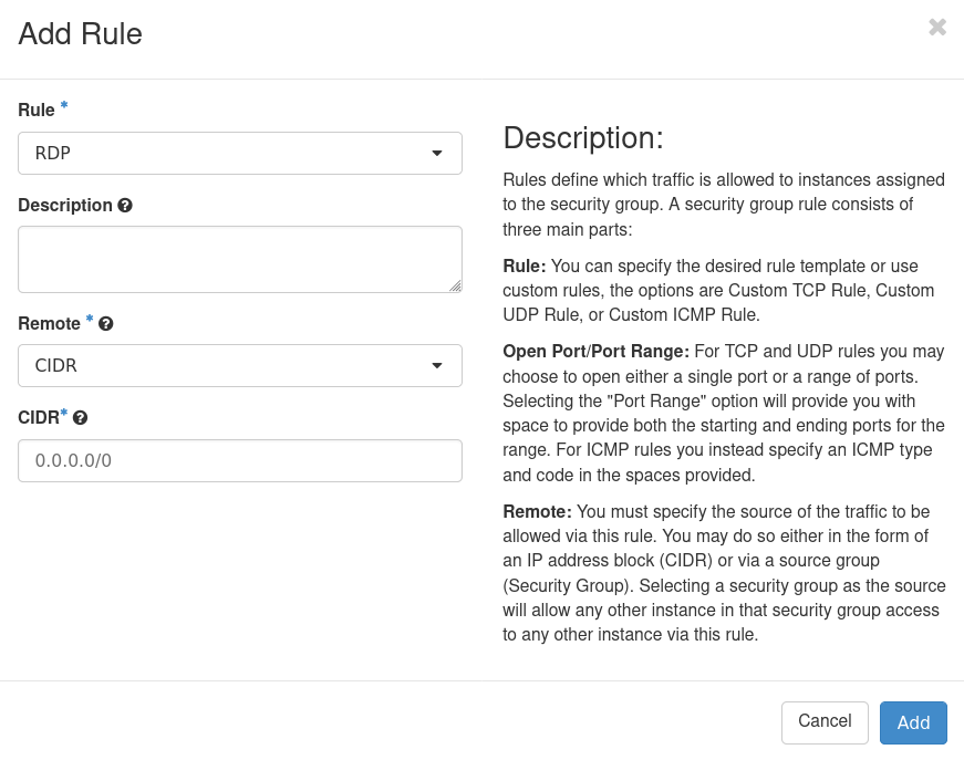 3. Allow xrdp connection by adding appropriate rule to the VM's security group. The port number is 3389, but direct Rule: RDP option is also available.