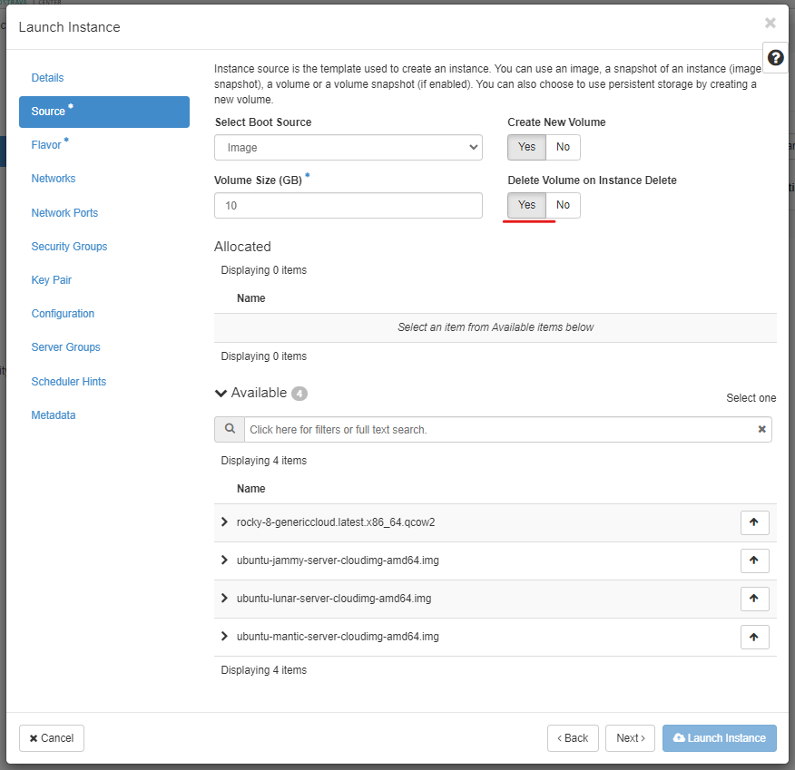 3. Choose an image from which to boot the instance. Choose to delete the volume after instance delete. Click Next.