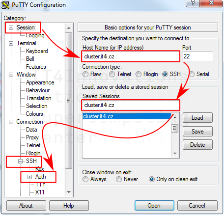 - Enter Host name and Save session fields with login address and browse Connection - SSH - Auth menu. The Host Name input may be in the format "username@clustername.it4i.cz" so you do not have to type your login each time. In this example, replace the word