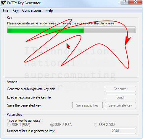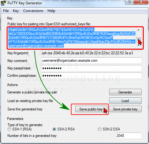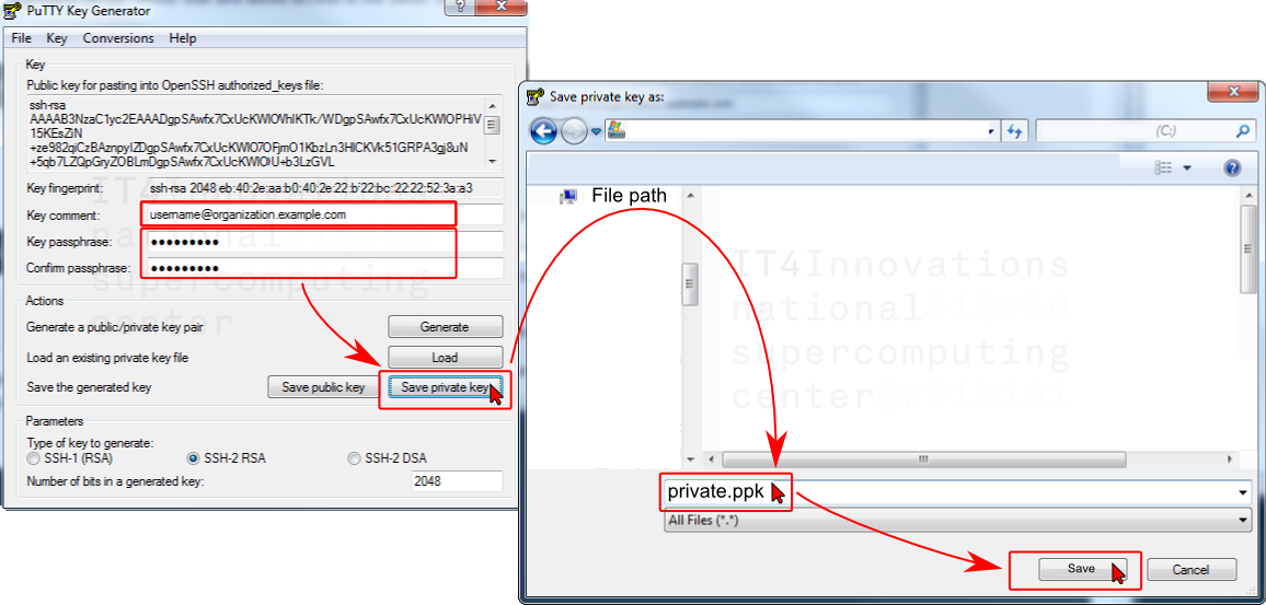 - Enter a comment for your key using the 'username@organization.example.com' format. Enter a key passphrase, confirm it and save your new private key in the ppk format.