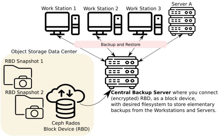 Pokud máte centralizovaný zálohovací systém (sada skriptů, bacula, BackupPC…) vyžadující lokální filesystém, pak vám doporučujeme použití služby RBD, viz níže. RBD obraz je možné připojit přímo ke stroji, kde běží centrální zálohovací systém, jako blokové zařízení. RBD je možné opatřit snapshoty viz, popis služeb, jako ochranu proti nechtěnému přepsání anebo ransomware útoku.