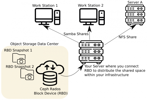 Pokud ukládáte živá data a potřebujete na úložiště pouštět jednotlivé uživatele, pak můžete využít službu RBD, kterou si připojíte k vám do infrastruktury pomocí linuxového stroje. Na připojeném blokovém zařízení si můžete udělat souborový systém, případně jej opatřit šifrováním a dále je reexportovat dovnitř vaší infrastruktury například pomocí samba, NFS, ftp, ssh, aj. (možno i formou kontejnerů zajišťujících distribuci protokolů do vaší interní sítě). Šifrování na straně klienta rovněž znamená, že přenos dat po síti je šifrován a v případě odposlechnutí během přenosu není možné data dešifrovat. Výhodou je, že si můžete vytvářet skupiny a spravovat práva zcela dle vašich preferencí, případně použít vaši lokální databázi uživatelů a skupin. Blokové zařízení RBD je dále možné opatřit snapshoty na úrovni RBD, tudíž pokud dojde k nechtěnému odmazání dat je možné se vrátit například ke snapshotu z předchozího dne.