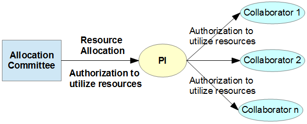 The computational resources of IT4I are allocated by the Allocation Committee via several allocation mechanisms to a project investigated by a Primary Investigator. By allocating the computational resources, the Allocation Committee is authorizing the PI to access and use the clusters. The PI may decide to authorize a number of their collaborators to access and use the clusters to consume the resources allocated to their Project. These collaborators will be associated to the Project. The Figure below is depicting the authorization chain: