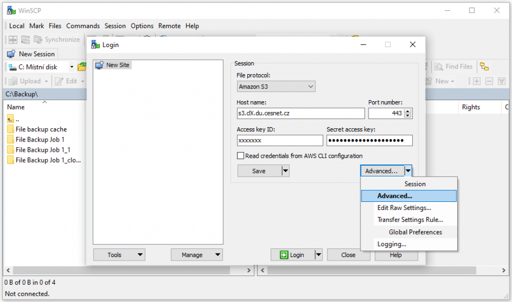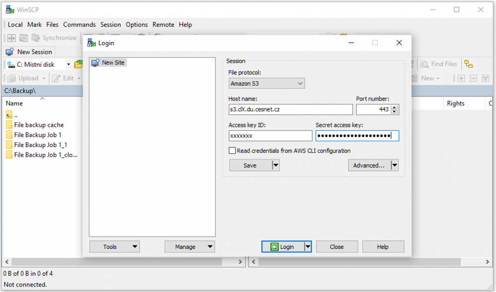 Then insert Host name s3.clX.du.cesnet.cz where replace X with the number of the cluster associated with your S3 account. Port 443 will be pre-filled automatically. Copy access_key into the field Access key ID and secret_key into the Secret access key - you received both of these keys encrypted from the administrators.
